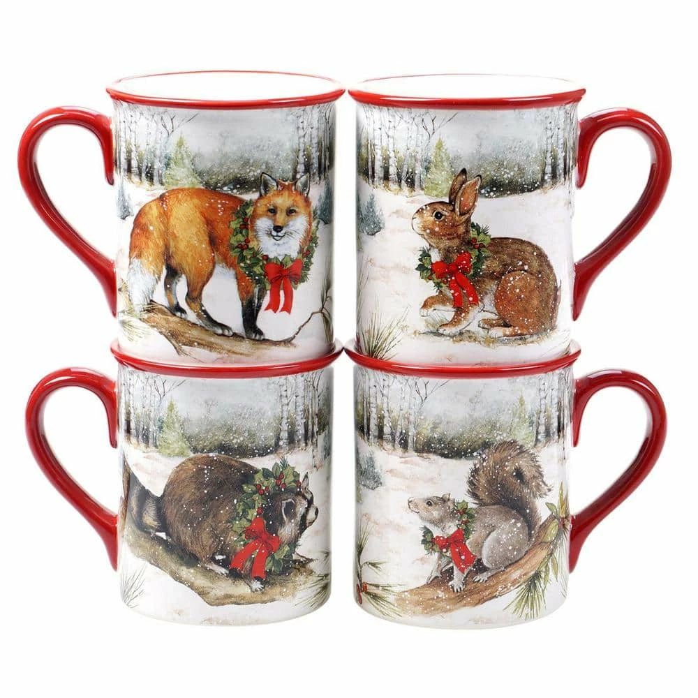 Beautifully illustrated forest creatures decorate Certified International’s “Winter Lodge” ceramic dinnerware and serve ware collection. Each snowy landscape image is from art painted by Susan Winget and features deer, foxes, raccoons, squirrels and rabbits, joined by bright red cardinals. The 3-d ceramic lodge house cookie jar and candy plate complete the rustic setting, along with the adorable 3-d squirrel and rabbit S and P set .