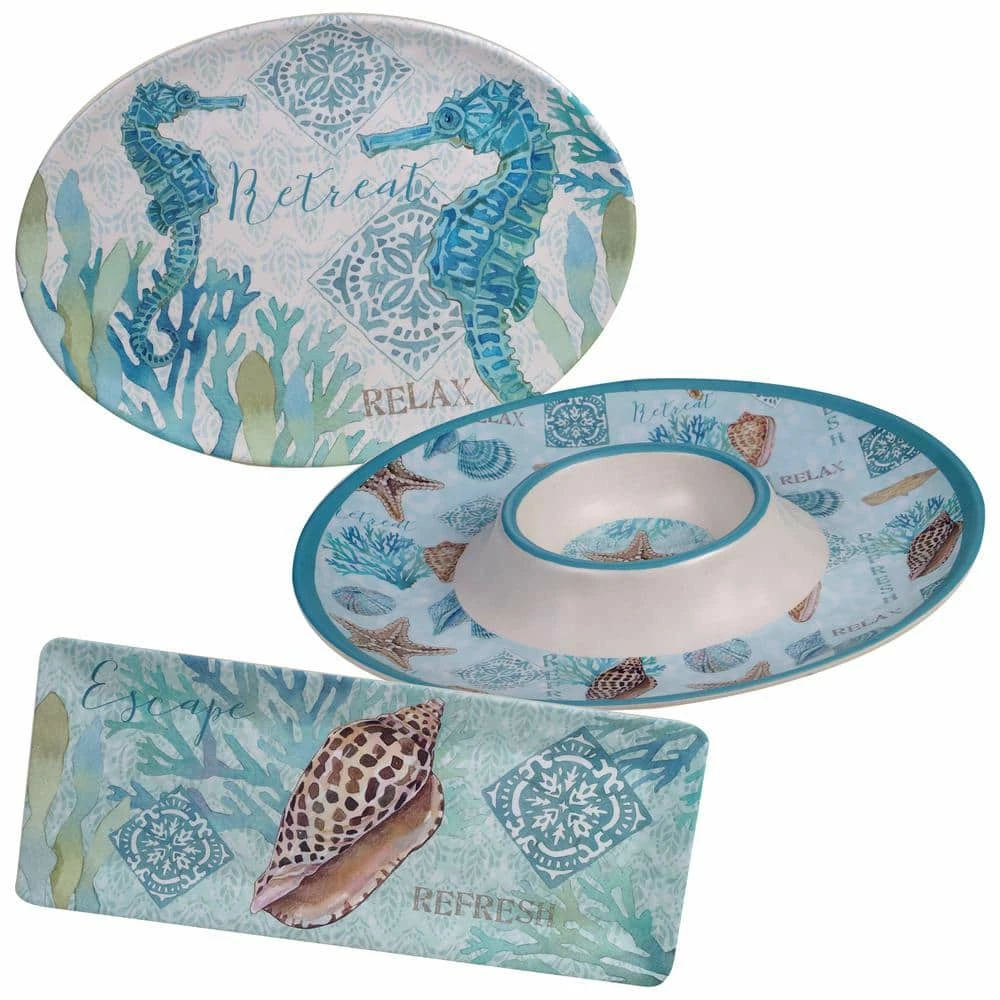 Beautiful coastal designs in shades of aqua and blue decorate Certified International’s Beachcomber bamboo fiber dinnerware and serve ware by Andrea Tachiera. Dine and entertain in style with these durable pieces made from bamboo fiber which is a food safe, eco-friendly renewable resource, non-toxic and BPA free. Beautifully detailed with a medley of vibrant hues. Includes 1 in. to 14.5 in. Chip and Dip, 1 in. to 18 in. Oval Platter and 1 in. to 19 in. Rectangular Tray.
