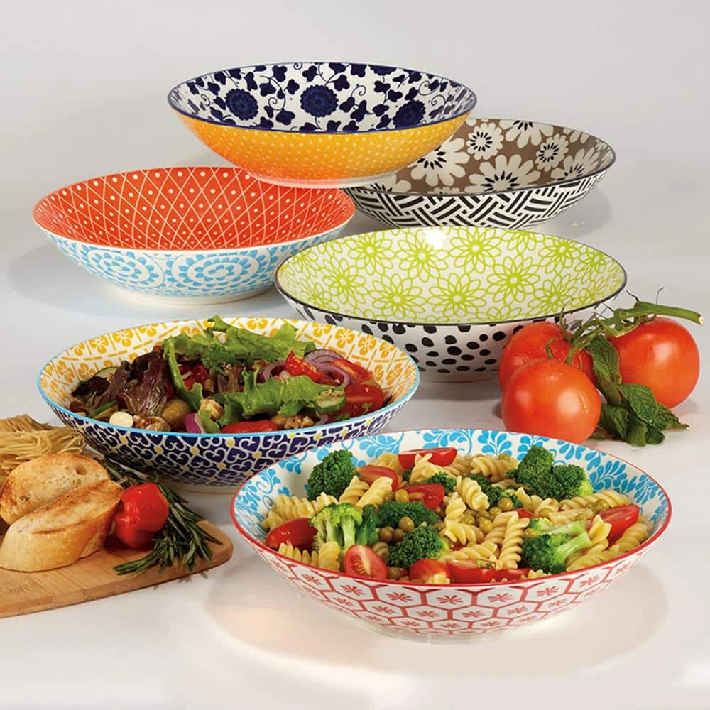 The Chelsea Set of 6 dinner bowls with colorful mix-n-match floral and geometric patterns is a fun addition to any table. Dinner bowls are the new dinner plates and these porcelain bowls are perfect for serving meals in a bowl, as well as salads, soups, pasta and desserts. Generously sized at 9″ diameter by 2.25 “deep, dishwasher and microwave safe for easy care.