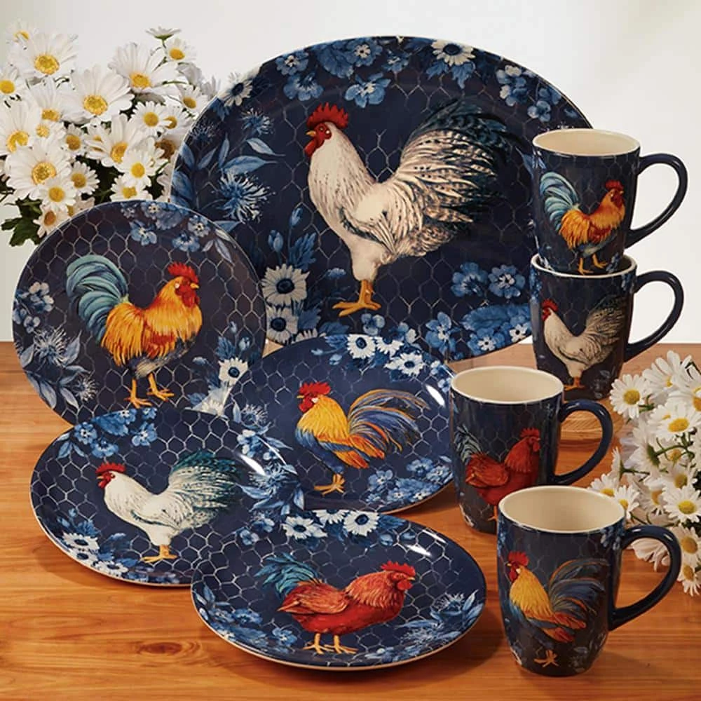 A colorful country rooster is silhouetted on rich indigo blue on Certified International’s Indigo Rooster Oval Platter designed by the popular artist Susan Winget. Featuring a beautifully detailed rooster, with floral and chicken wire accents on this 16 in. long x 12 in. wide ceramic serving platter for your special table. Coordinating dinnerware, serveware and storage is available to complete the farmhouse look in your home.