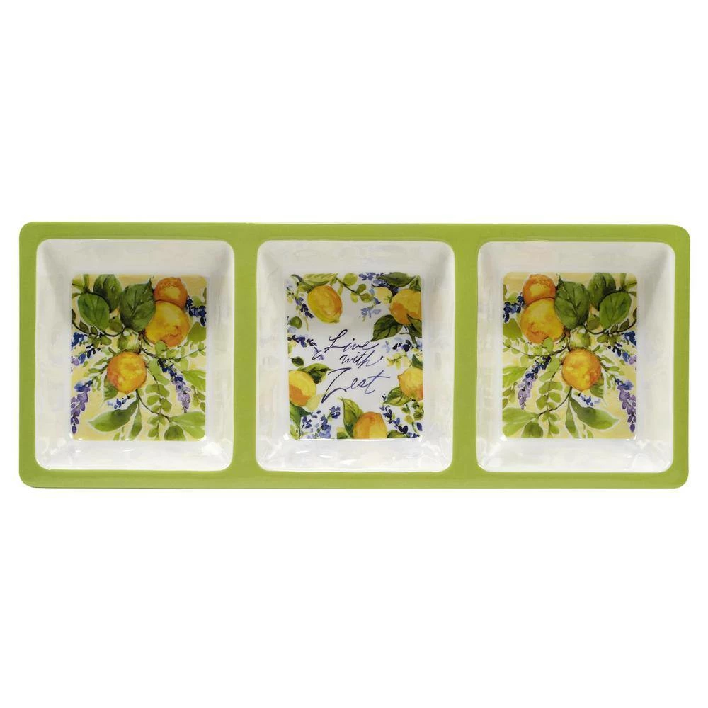 Add some colorful zest to your outdoor and indoor dining with Certified International’s Lemon Zest 3-piece. Melamine Hostess Set. Featuring bright yellow lemons with lavender floral accents by the popular artist Susan Winget, in heavyweight 100% melamine. This versatile set includes a 14.5 in. Chip and Dip, 14.5 in. x 5.5 in. 3 section tray and a 19 in. x 8 in. rectangular platter offers fun options for all your serving and entertaining needs. Be sure to order the rest of the coordinating melamine dinnerware and serveware, including fun 3-d lemon sets to complete your dining experience.