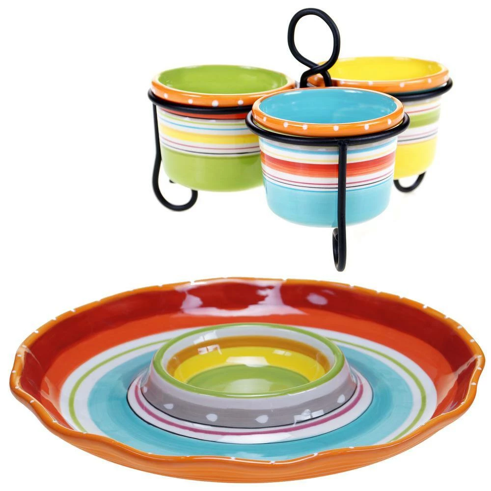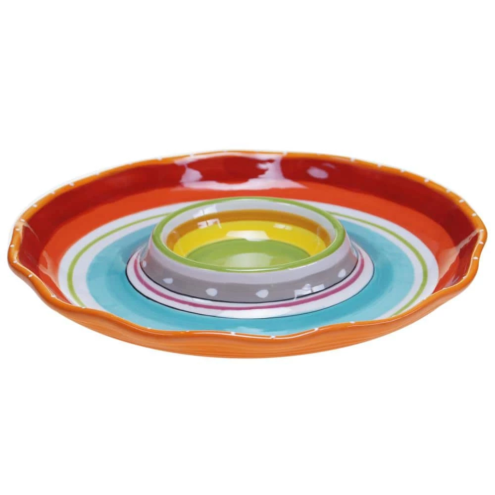 This Mariachi Chip & Dip set from Certified International is a perfect way to bring the festive fun of a fiesta to your table. Durable earthenware is hand painted and glazed in bright energetic colors that are ideal for everyday use. A Nancy Green Design.
