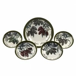 Serve your favorite pasta or salads in Certified International’s “Olive d ‘Italia” 5-piece. Pasta Set. Each bowl features beautiful images of a different olive variety and name in Italian, designed by the artist Jessica Mundo. This ceramic serving set consists of 1 pc 12.25 in. Dia. x 3 in. H Large bowl and 4 pcs. 8 in. Dia. x 2 in. H Individual bowls. Sold in an attractive gift box, great for shower, hostess or housewarming gifts.