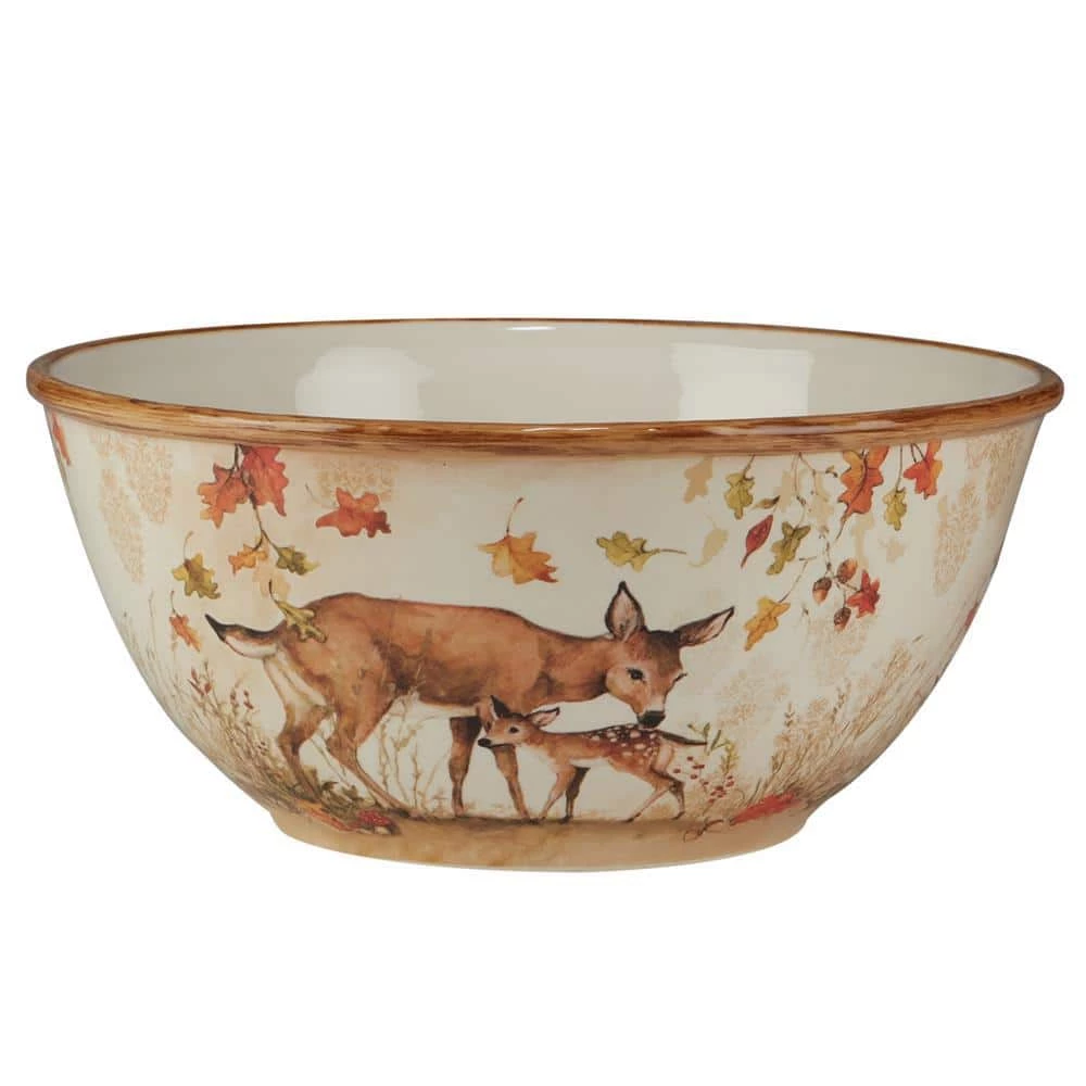 Charming forest deer are featured on Certified International’s “Pine Forest” Deep Bowl designed by the popular artist Susan Winget. The sweet deer and babies are shown in a natural forest setting with embossed hand painted ceramic woodgrain rims on a generously sized 10 in. Dia. x 4 in. H ceramic bowl, perfect for serving salads, pasta or fruit. Coordinating dinnerware, serveware and a 3-d owl Cookie Jar is available to complete the look of a rustic forest in your home.