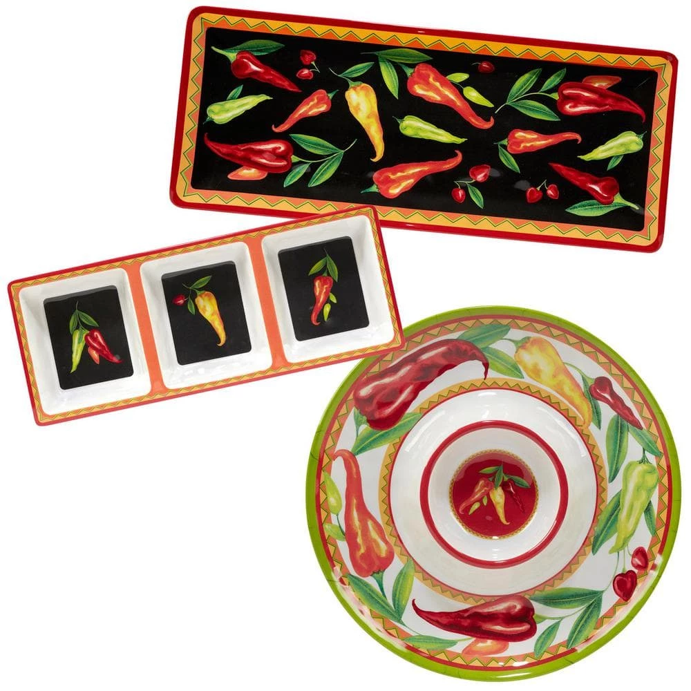 Spice up your table with Certified International’s “Red Hot” 3-piece Hostess Set. Made of durable heavyweight 100 % melamine, this versatile set has fun serving pieces including a round Chip and Dip 14.5″ Dia., a 3 section Relish Tray 14.5 in. L x 5.75 in. W and a Rectangular Platter 19 in. L x 8 in. W. Each piece features colorful tossed peppers with bright Tex Mex borders designed by artist Tracy Flickinger. Perfect for your outdoor or indoor dining. Be sure to order the coordinating dinnerware and serveware to complete this exciting look.