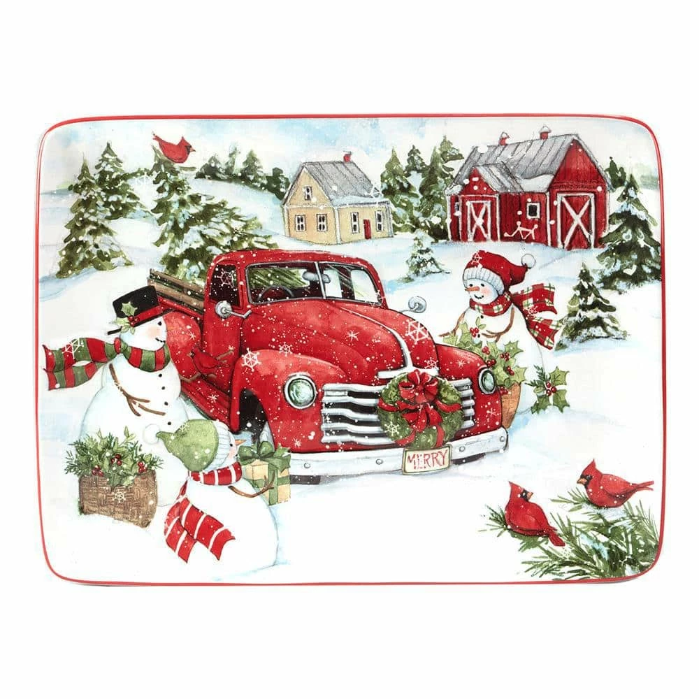 Celebrate the holiday season with Certified International’s “Red Truck Snowman ” Rectangular Platter designed by the popular artist Susan Winget. A snowy scene of smiling snowmen alongside a shiny red truck loaded with their holiday tree decorates this generously sized 16 in. L x 12 in. W ceramic Platter. Great for serving your favorite family style holiday meal. Coordinating dinnerware, serve ware and 3-d accessories are available for a colorful holiday table.