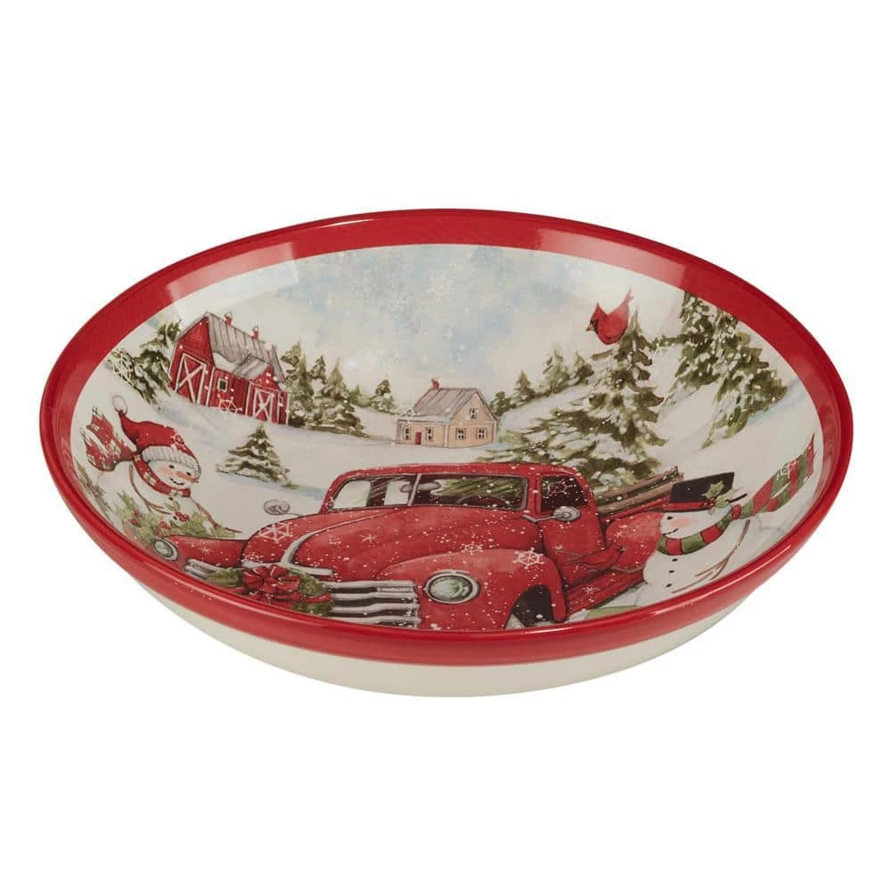 Celebrate the holiday season with Certified International’s ” Red Truck Snowman” Serving/Pasta Bowl designed by the popular artist Susan Winget. A snowy scene of smiling snowmen alongside a shiny red truck loaded with a holiday tree decorates this piece. This 13 in. D x 3 in. H oversized ceramic bowl is great for serving pasta, salads and one dish meals. Coordinating dinnerware, serve ware and 3-d accessories are available for a colorful holiday table.