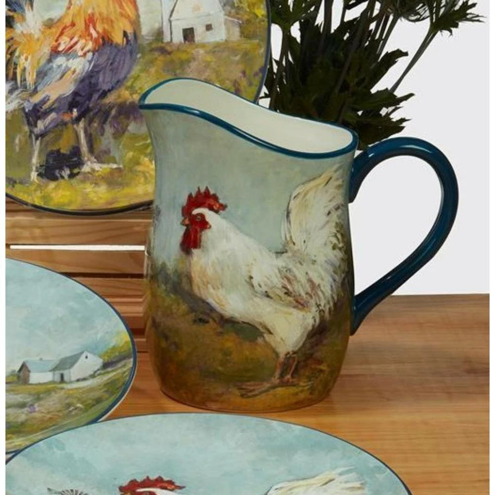 Certified International’s Rooster Meadow Pitcher features beautiful white roosters in a countryside scene reproduced from the original art painted by the popular designer Susan Winget. This 3 qt. ceramic Pitcher is great for serving your favorite beverage or as a decorative vase. Coordinating dinnerware, serveware, storage and 3-d items are available to complete the farmhouse look in your home.