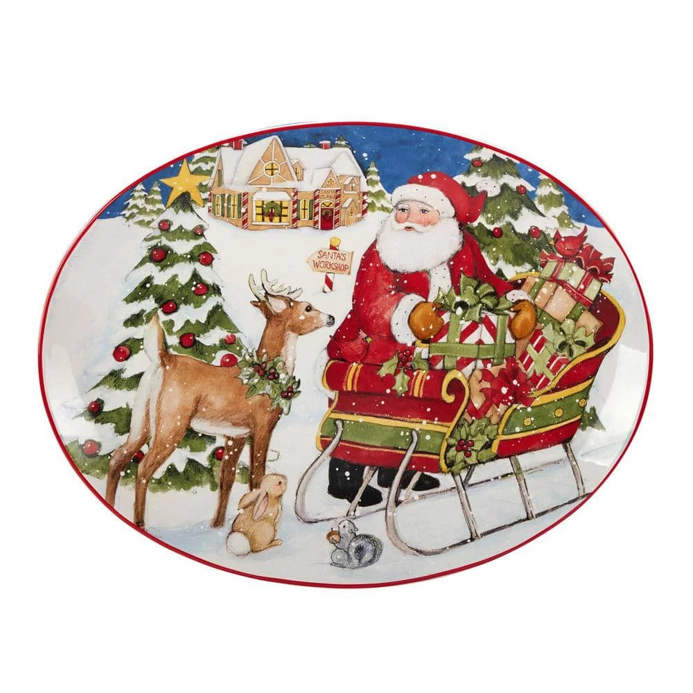 Celebrate the holidays with Certified International’s “Santa’s Workshop” Oval Platter designed by the popular artist Susan Winget. Serve your favorite holiday meal with this generously sized ceramic 16 in. L x 12 in. W platter, decorated with Santa loading his sleigh at the North Pole. Great for serving family style holiday meals. Coordinating dinnerware, serveware and 3D accessories are available to complete the look of Christmas in your home.