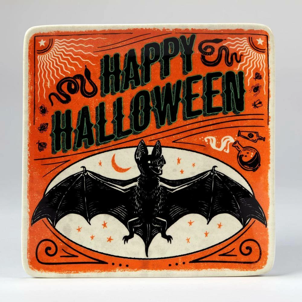 Celebrate Halloween with these spooky themed “Scaredy Cat” Set of 4 Dessert Plates from Certified International, designed by the artist Janelle Penner. These colorful ceramic 8.5 in. square plates come in 4 assorted designs featuring bats, skeletons, pumpkins and black cats, perfect for entertaining your family and friends on this scary holiday. Be sure to get the matching ceramic mugs, canapes and coordinating serveware, as well as the fun 3-d items and melamine serveware for all your trick or treaters.