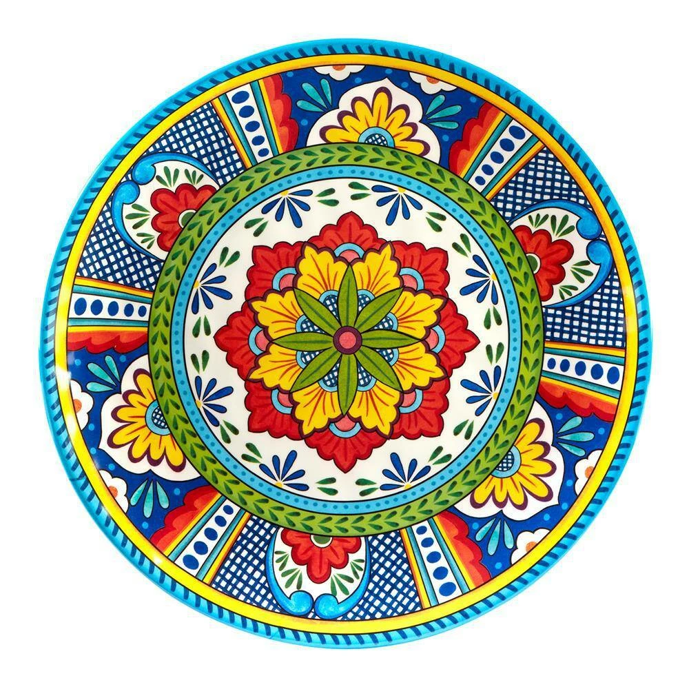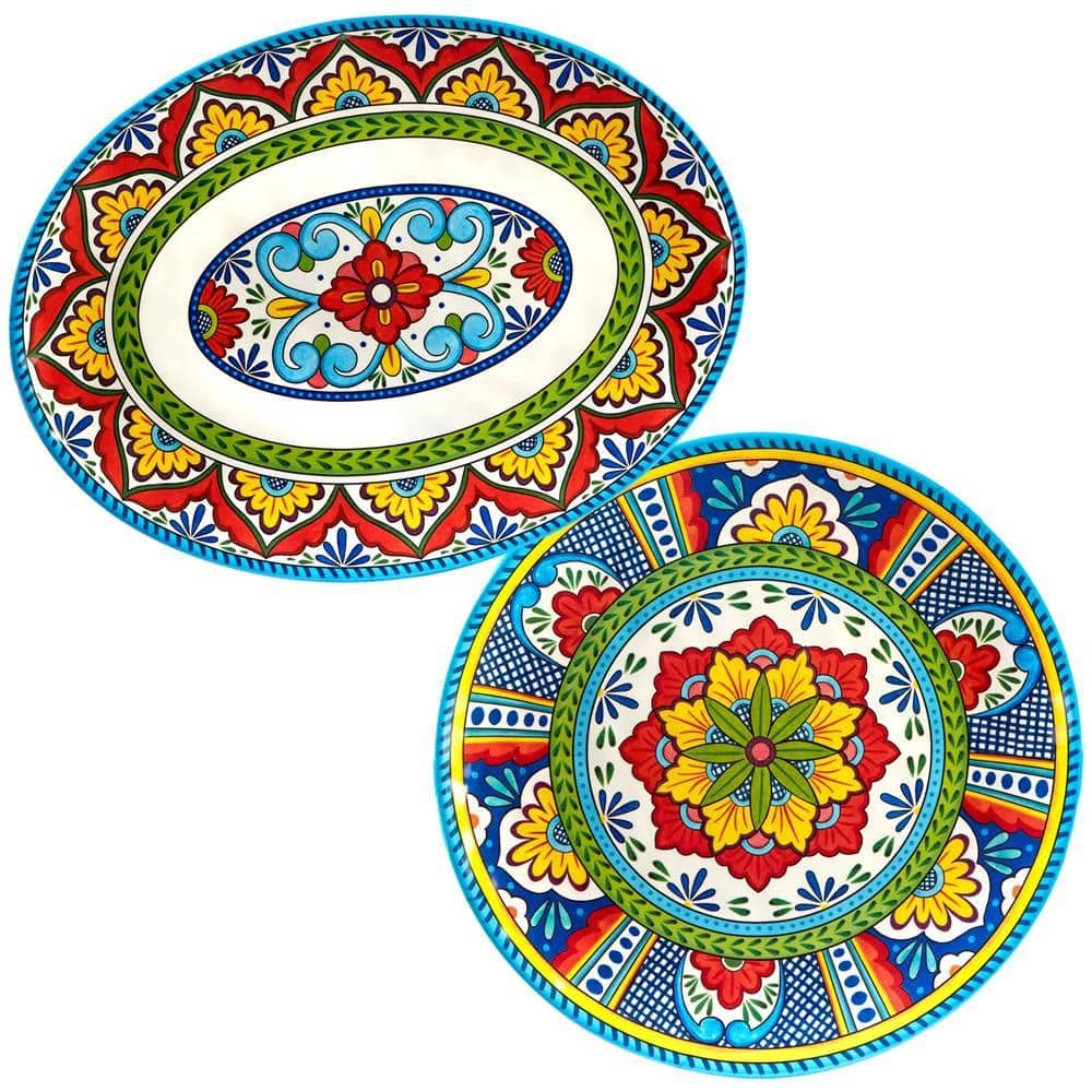 Certified International’s “Seville” 2-piece Platter Set, reflects the bright colors and patterns of traditional Talavera style pottery, designed by the artist Nancy Green. Made of durable, heavyweight 100% melamine, the generously sized 14 in. Dia Round Platter and 18 in. long X 13.5 in. wide Oval Platter are very special additions to your indoor or outdoor dining table. Great for serving BBQ and family meals. Order the matching melamine dinnerware and serveware.