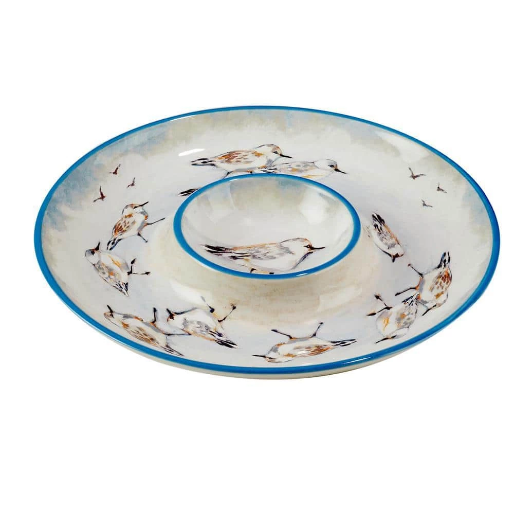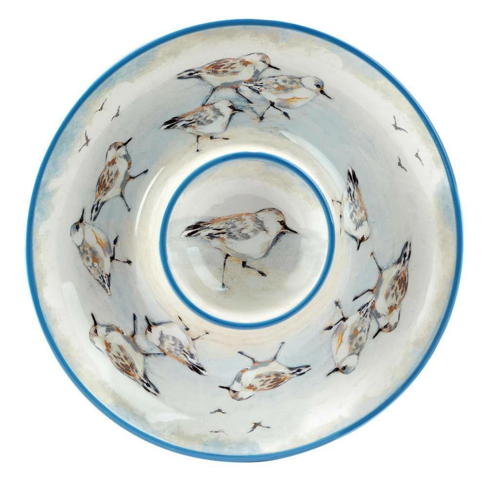 Beautiful images of coastal birds bring memories of the beach to your table with Certified International’s “Shorebirds” Chip and Dip serving platter designed by the popular artist Susan Winget. Scurrying sandpiper birds are featured on this generously sized 13.5 in. Dia ceramic Chip and Dip, with 2 convenient sections, perfect for serving shrimp cocktail, chips and dip or crudite. Coordinating dinnerware and serveware is available to complete this coastal look in your home.