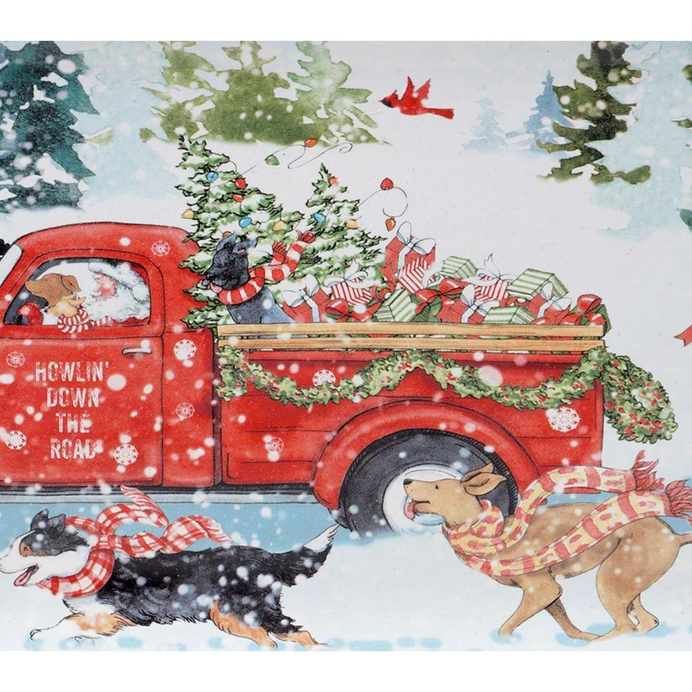Whimsical scenes of dogs frolicking in the snow decorate Certified International’s ” Special Delivery ” collection of ceramic dinnerware and serveware, along with bamboo fiber pet accessories and ceramic 3D treat jar and SandP set . Designed by Sherri Buck Baldwin, these adorable dogs are joined by traditional holiday Santa and snowman figures, with red trucks , sleighs and holiday trees in the snow! Add this lovely collection to your holiday decor.