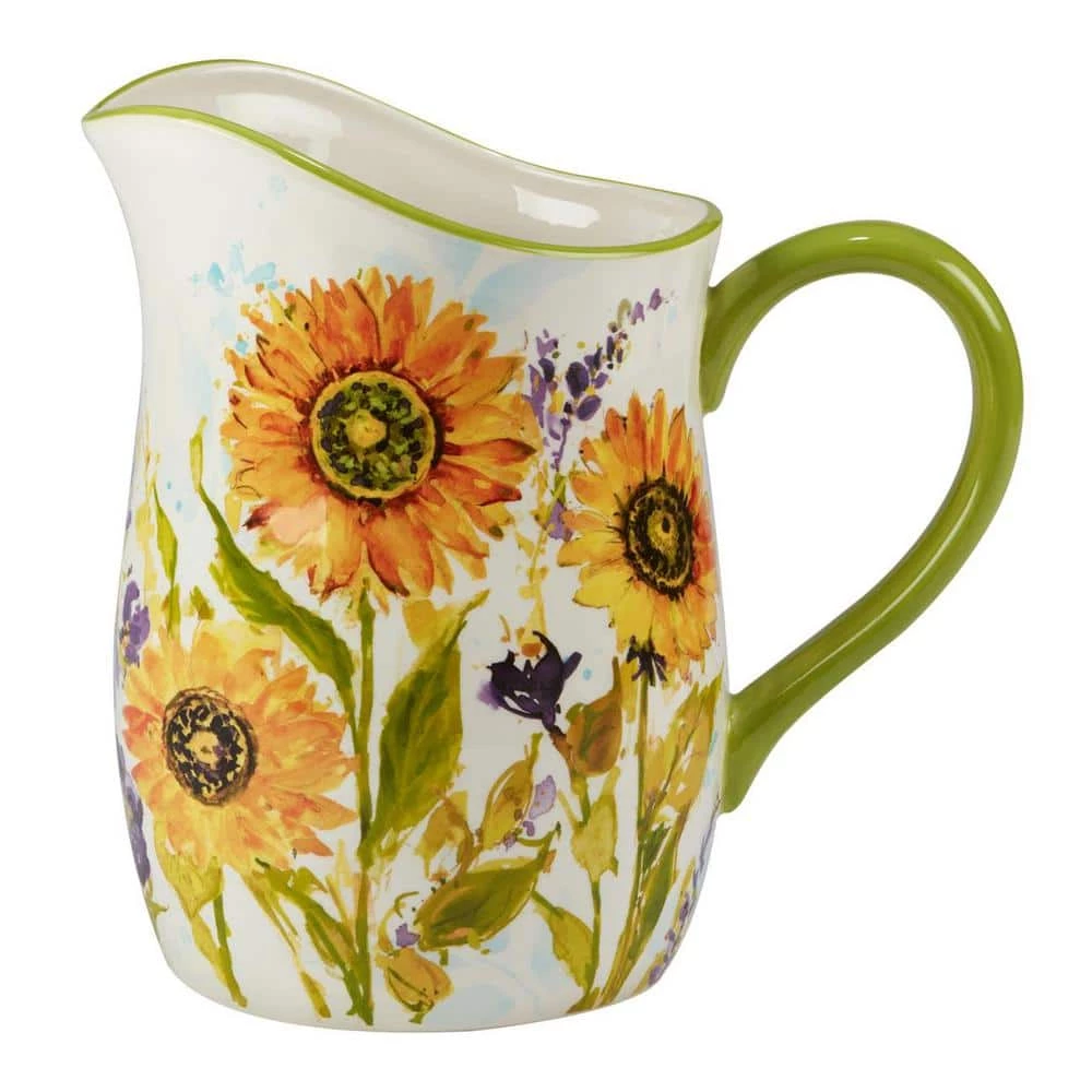 Certified International’s “Sun Garden” Pitcher brings the sunshine into your home. Bright and bold sunflowers from beautiful art by Susan Winget adorn this 3 qt. capacity ceramic Pitcher which turns your table into a garden. Be sure to order the other coordinating dinnerware, storage and serveware which includes uniquely sculpted and hand painted 3-d sunflower items sold separately.